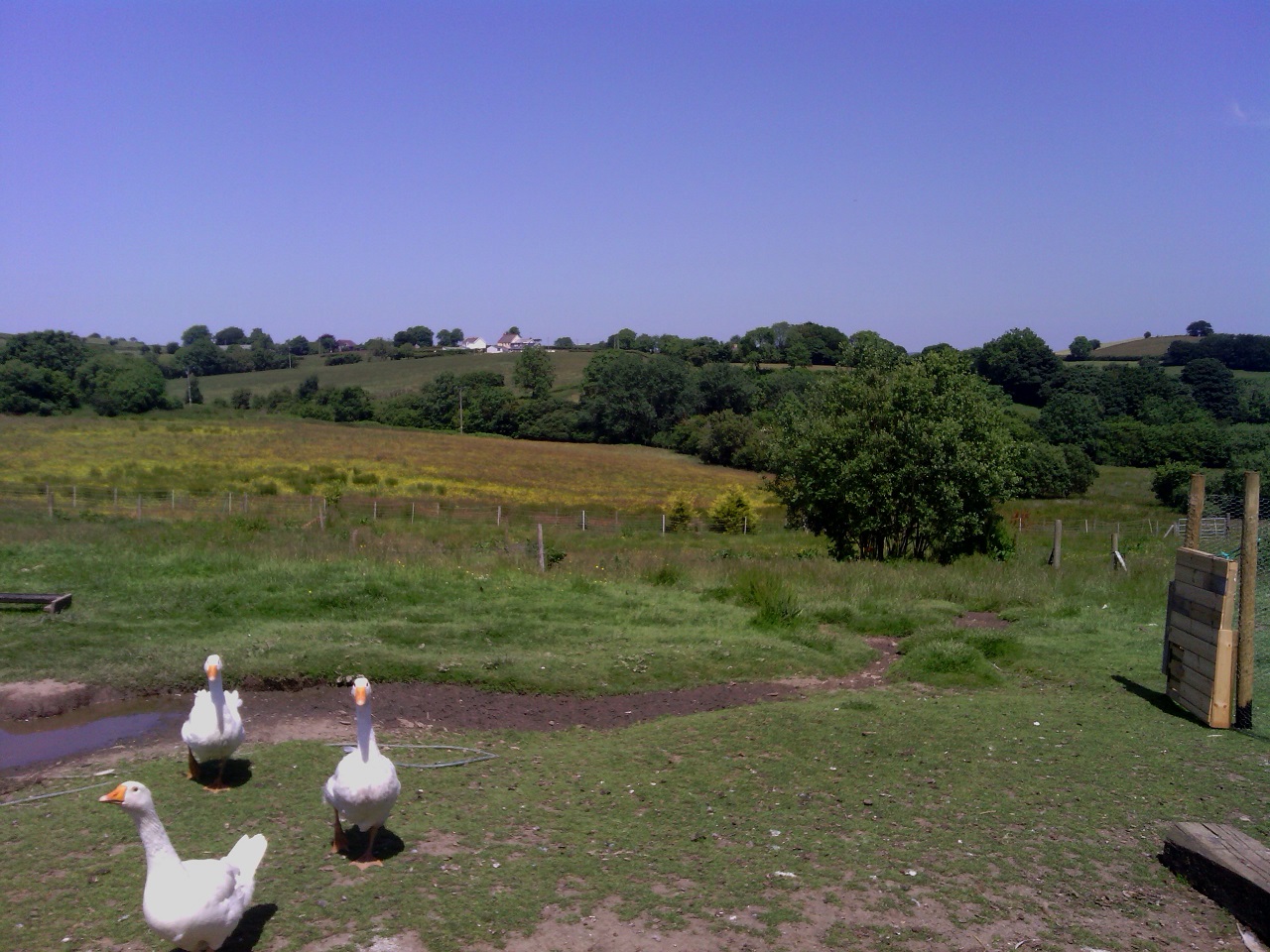 This is the view… The Cambrian Mountains and three of our geese just before they decided to chase me away.