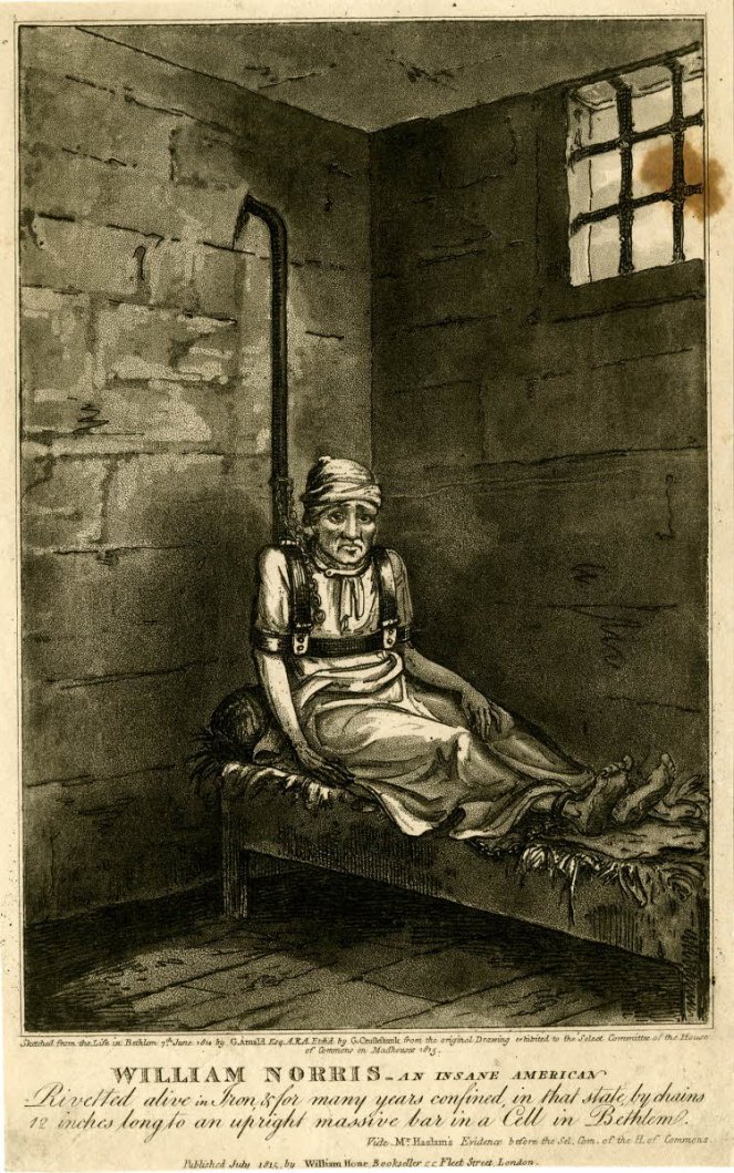 In 1800 a sailor, James Norris, was placed in Bethlem Hospital, under a court order, after attacking several people whilst in a rage. Having been placed in Bedlam he raged against the conditions and almost killed one of the keepers. Dr Munro and the apothecary, Haslam, gave him the diagnosis of being incurable. Norris’s ability to escape meant Haslam created a restraint for Norris, who was kept in a cage. The dystopia that he lived in is all the more horrifying because it existed. In 1814 a philanthropist, Edward Wakefield, visited Bedlam and found Norris chained to a pole, a mere shadow of the sailor he’d been. What shocked Edward most was the fact that Norris could hold a conversation. Norris became the poster boy for asylum reform and slowly the law and social expectations changed. For Norris, his conditions got better, he was given a low security cell and the ability to move around. But for him this small freedom only lasted three months and ended in tragedy.