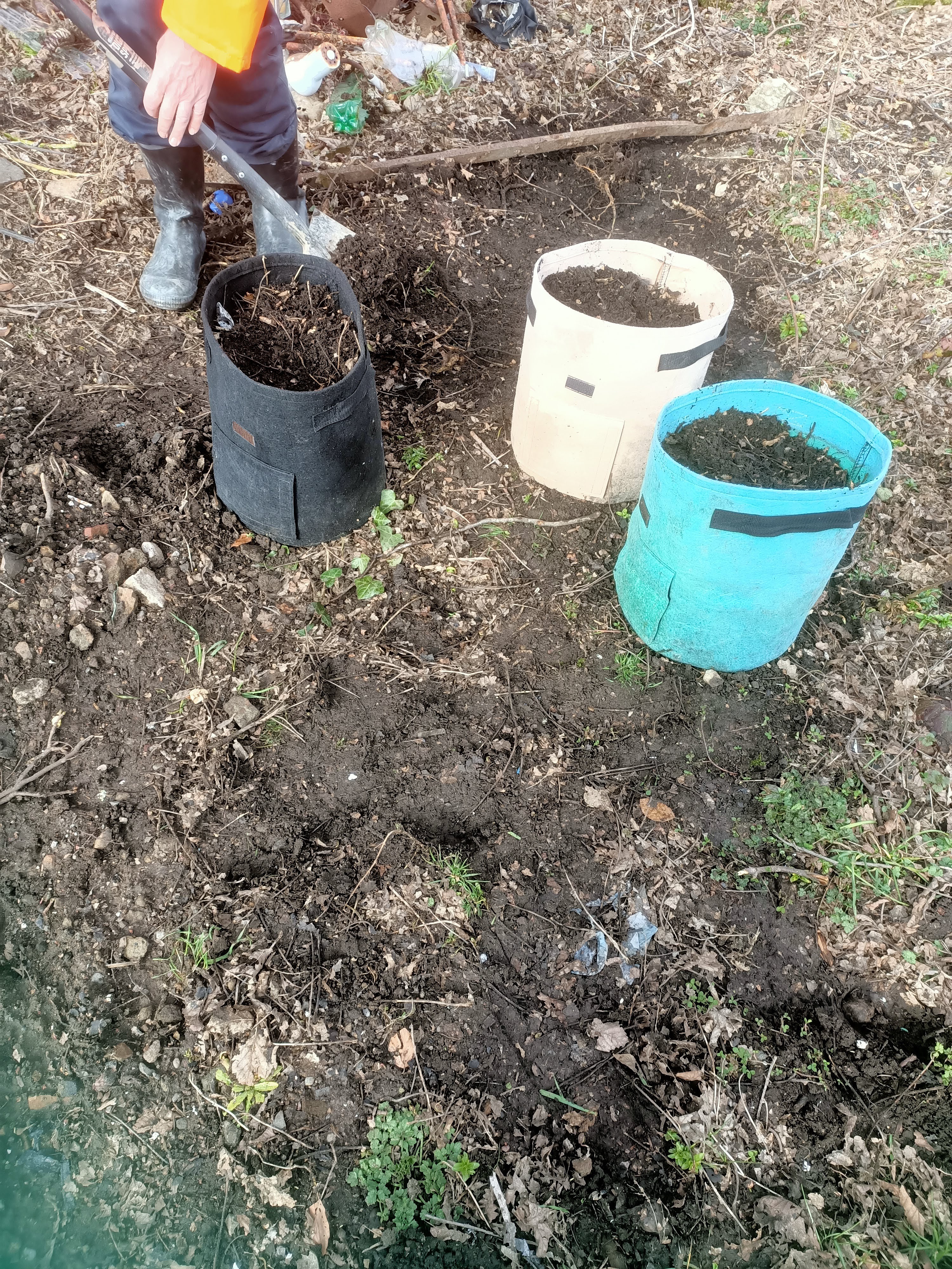 Then the potatoes. A little early but the ones I kept back from last year were ready to go. So we dug out the felt potato sacks (three years old and still going strong) filled them with layers of leaf mould, soil and seed potatoes. Boom… done! Last year we put the potatoes direct in the ground, but this year to save space I decided to grow them in the bags. I am putting in a huge amount of vegetable types, from tomatoes to khol rabi, so we need the space.