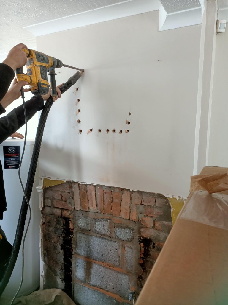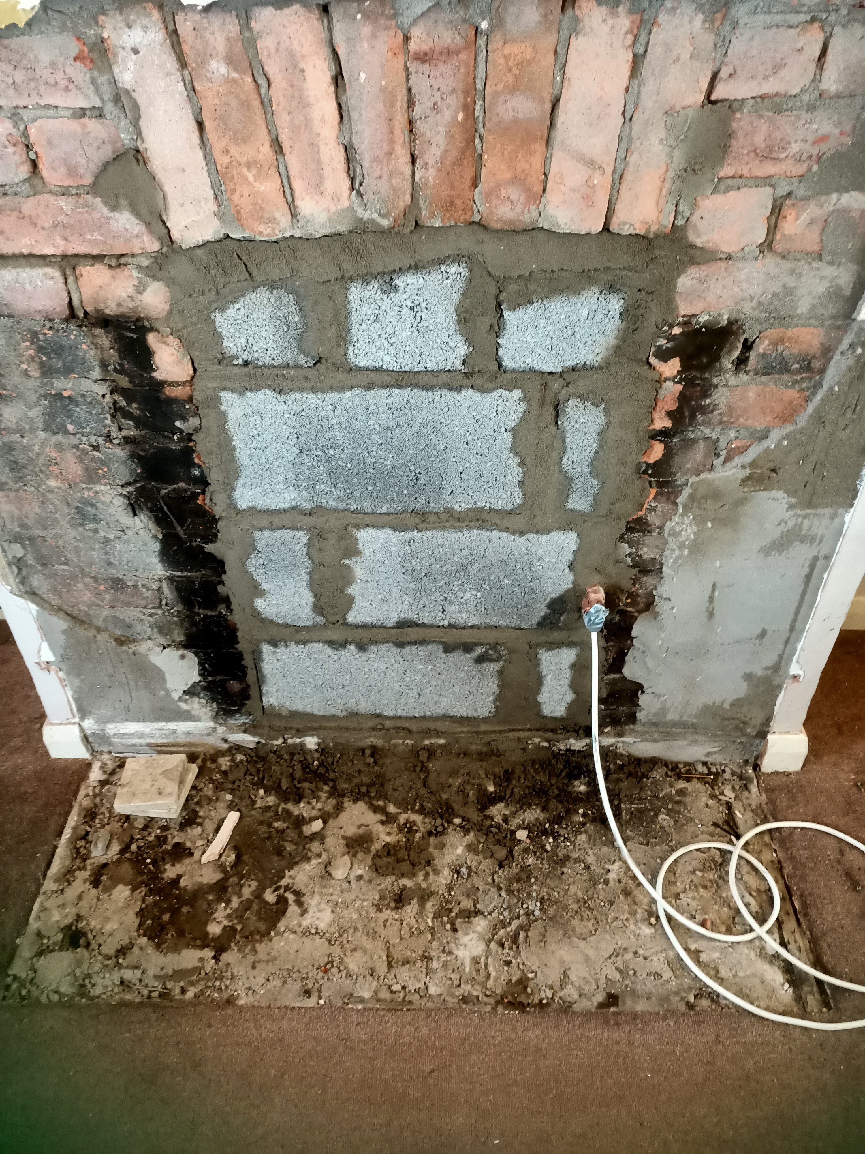Today is all about linings and chimneys. Yesterday Birds Hill finished the blocking up and moved the stove inside. Although it is still in it’s box and I have no idea what it looks like. So excited to see it! And today we are talking new liner and hearth. I’m kind of hoping that the biomass boiler will come out of its box, but I’m guessing that depends on the slate being fitted in place.