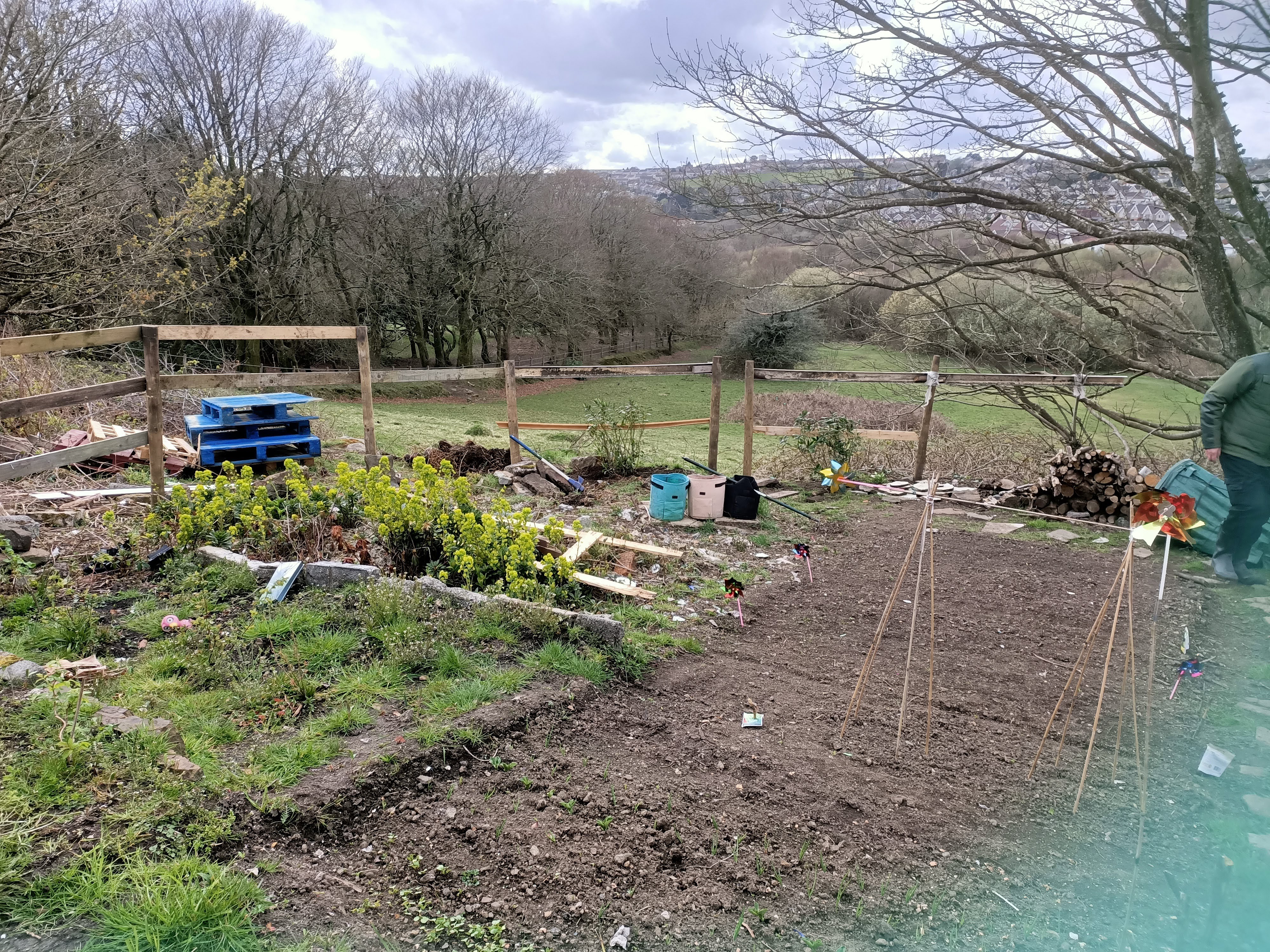 Not to be deterred we have been putting the the seeds in our veg patch. Now, if you didn’t know we are ‘borrowing’ a bit of wasteland. We have removed 2 ton bags of plastic and 6 bags of cans as well as 5 bags of rubbish that can’t be recycled. We have cleaned it up and removed the brambles. The beds are sort of there and we are improving the soil. There is still a ways to go, but we are getting there. Last year we grew a few bits but came unstuck when the horses, who are kept on the wasteland, got past the branches we had placed in the way and ate everything…
